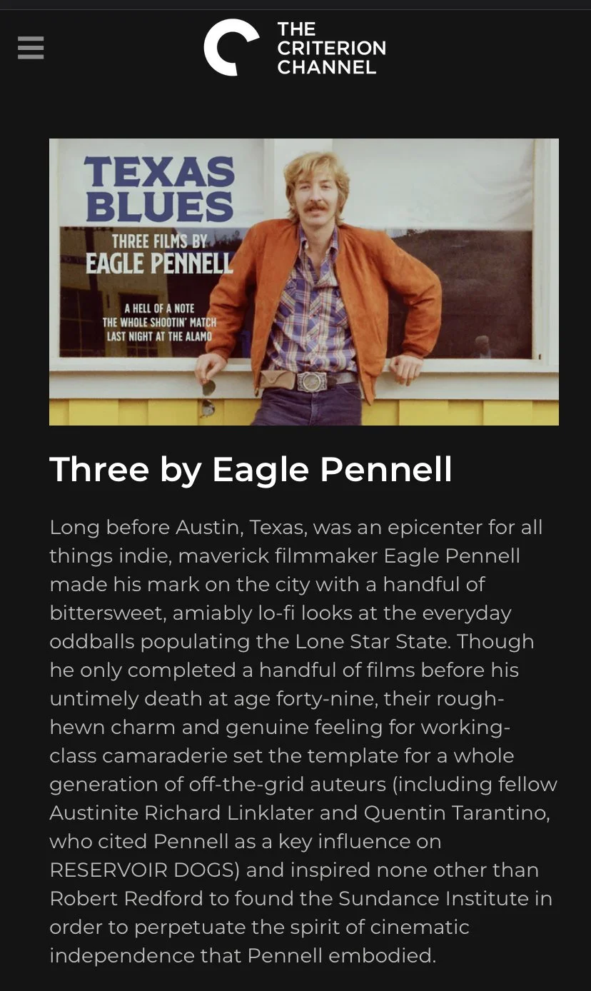 11. Last Night at the Alamo (Feature Film, winner at New York & Berlin Film Festivals-1983). Score. Streaming on The Criterion Channel (included in Ethan Hawke’s curated Criterion Texas Film Collection). Last Night at the Alamo is introduced by Ethan Hawke.
